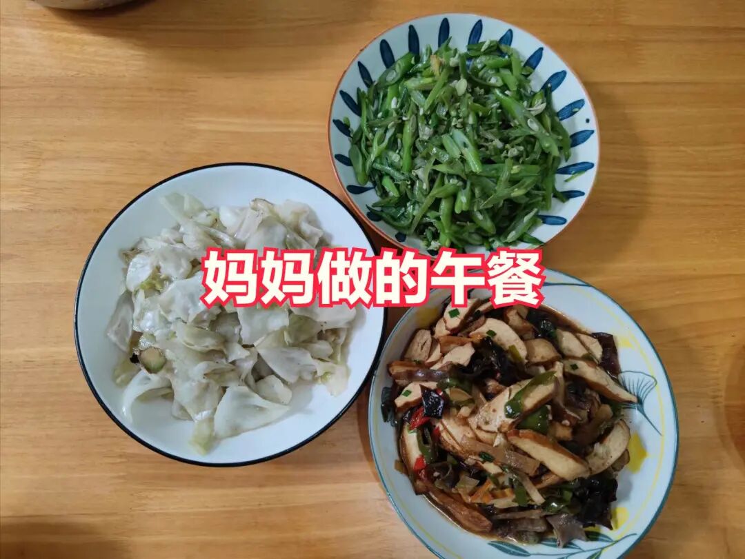 反观妈妈在家做的午餐伙食却显得太寒酸了,一家三口吃3个菜品,一个是炒豆干,一个清炒四季豆,一个清炒包菜。