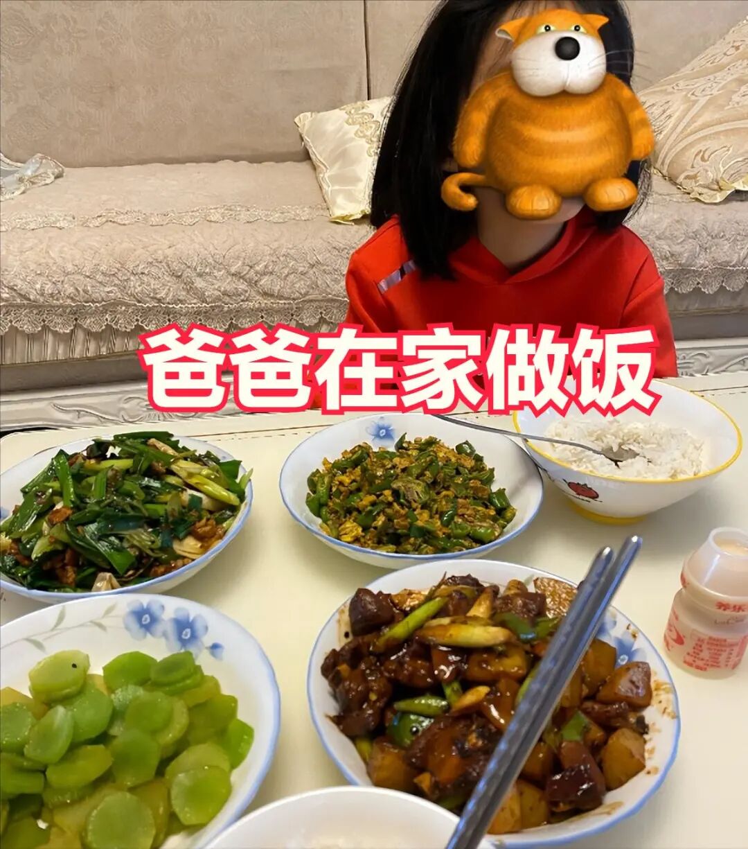 江西小朋友张玲玲晒出的爸爸在家做饭的图片可以看出,一家三口吃4个菜品,有清炒莴笋,有红烧肉,有辣椒炒蛋,有辣椒炒花蛤。