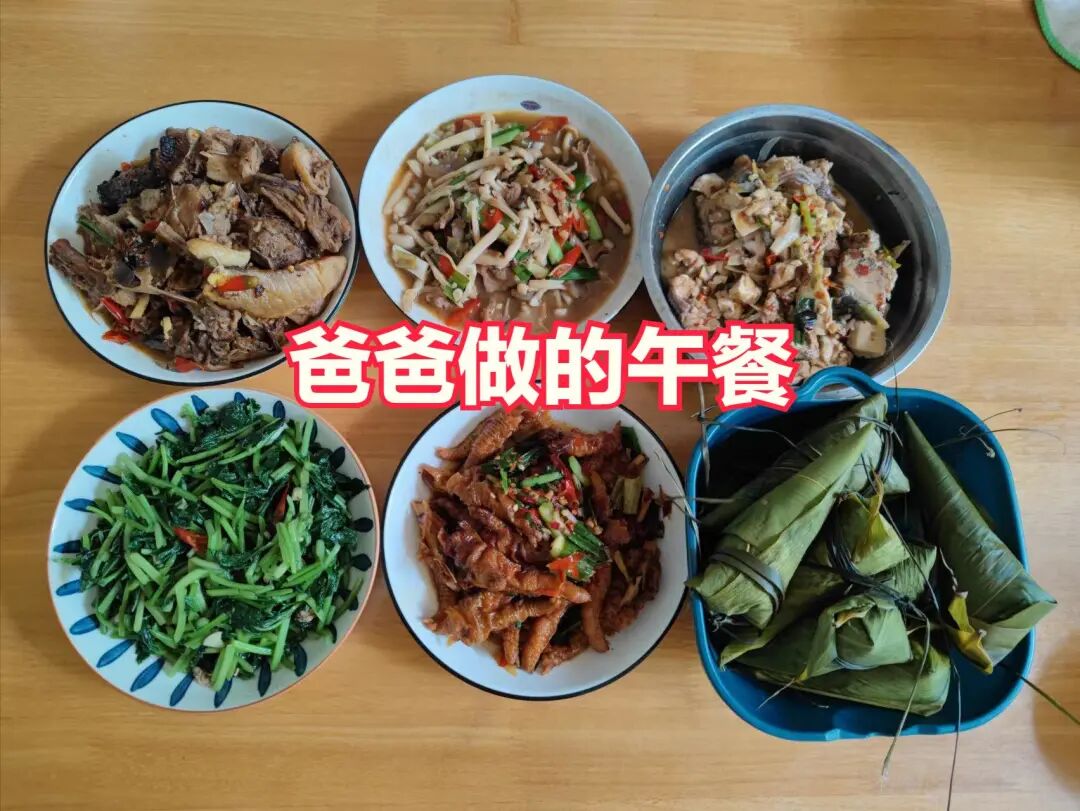 周末爸爸在家休息,给全家人做了一顿午餐,有6个菜品:啤酒鸭+海鲜菇炒肉+虎皮凤爪+清炒番薯苗+红烧鱼+蛋黄粽子。