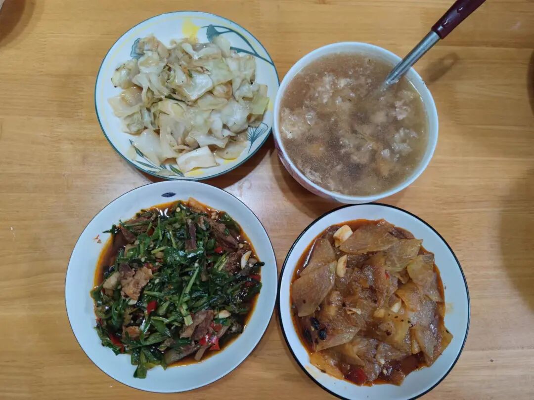 桌上全是素菜不见荤,看起来非常的清淡,要是没有豆干炒辣椒,别人还以为这是广东人的晚餐。