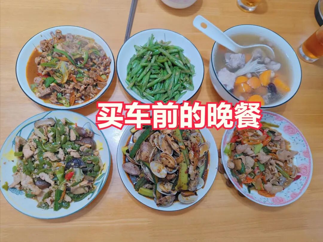 原本晚餐吃五菜一汤,结果买车第一天就只有4个菜,其中3个都是剩菜,老公表示压力大,家里有啥吃啥。