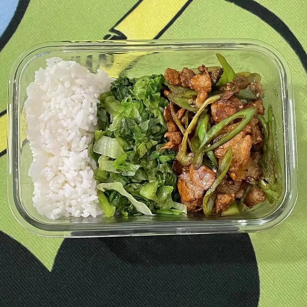 周二午餐便当:辣椒炒肉+清炒油麦菜。