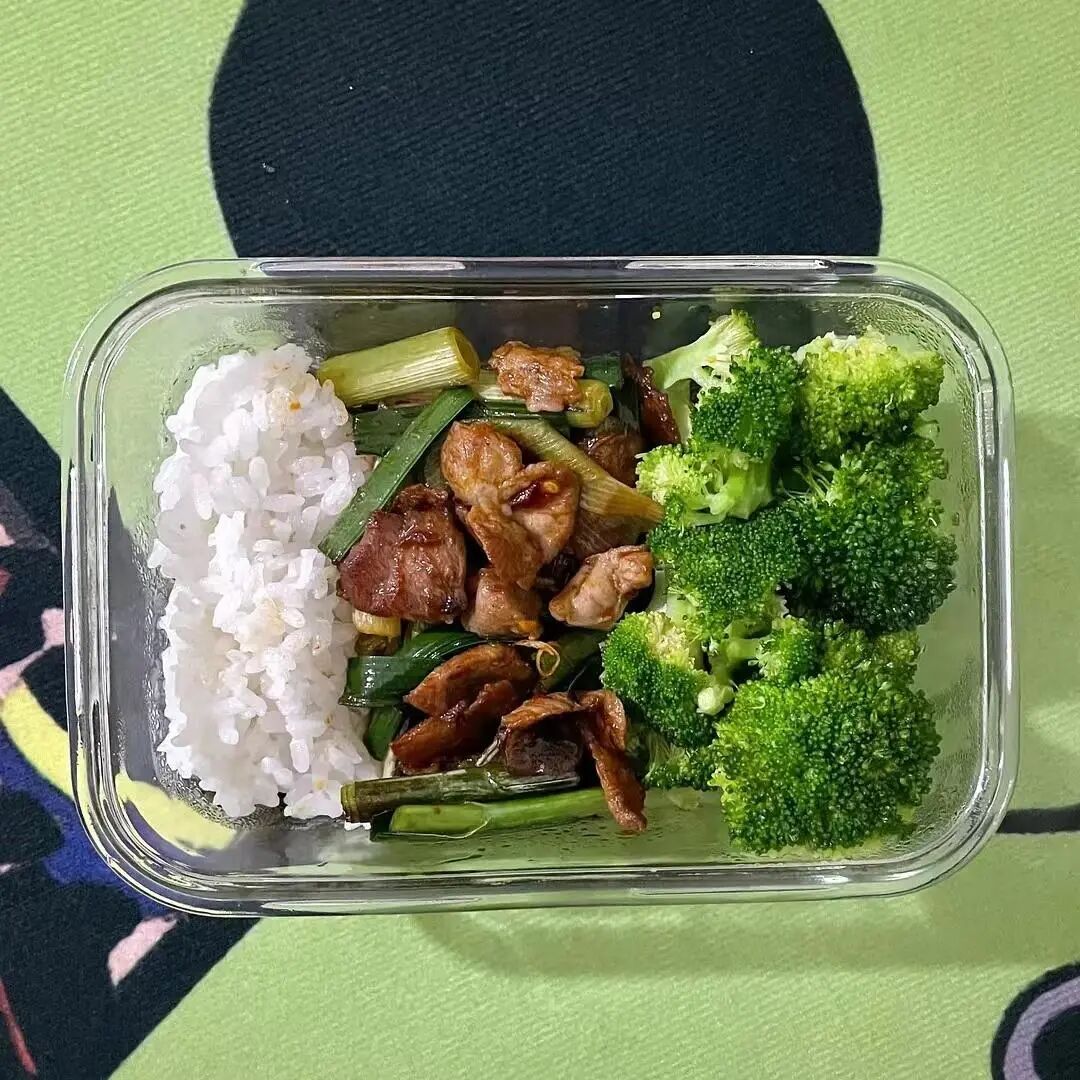 周三午餐便当:西蓝花+牛肉炒蒜苗。