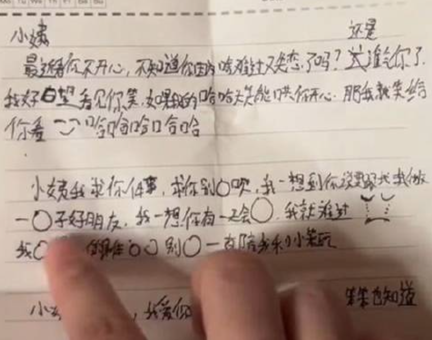 广东一女孩给小姨写信,小姨打开边读边被震惊,信中称“小姨我求你件事,你别死呗!”女孩解释后情绪逐渐崩溃大哭起来。小姨称自己才30来岁,孩子看自己最近心情不好,猜测失恋了,于是写了这封信,当时看到的时候真是哭笑不得。