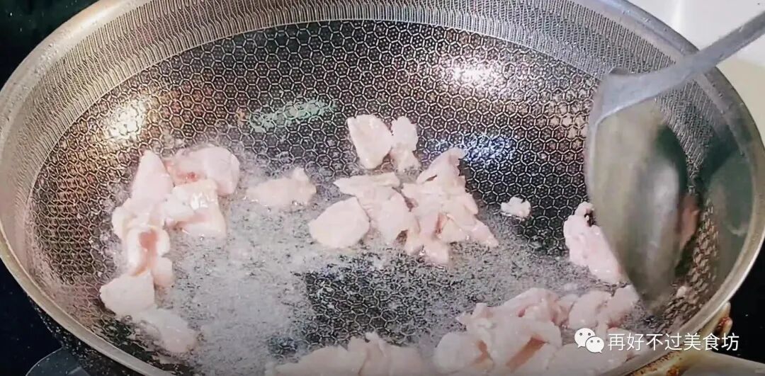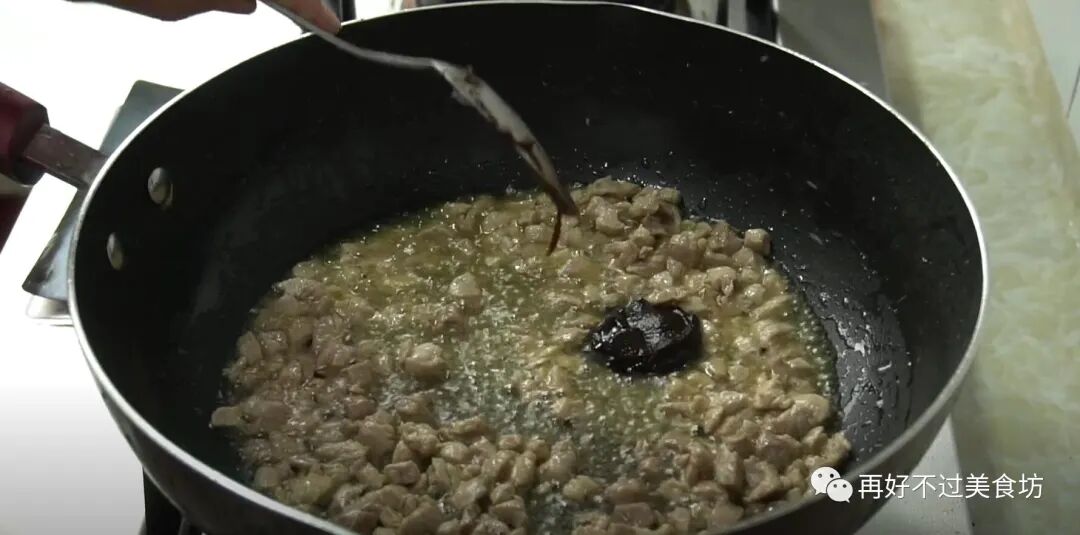 6、油留在锅里,加入切好的肉丁,先把肉丁炒到完全变色,加一勺甜面酱,炒出酱香味。