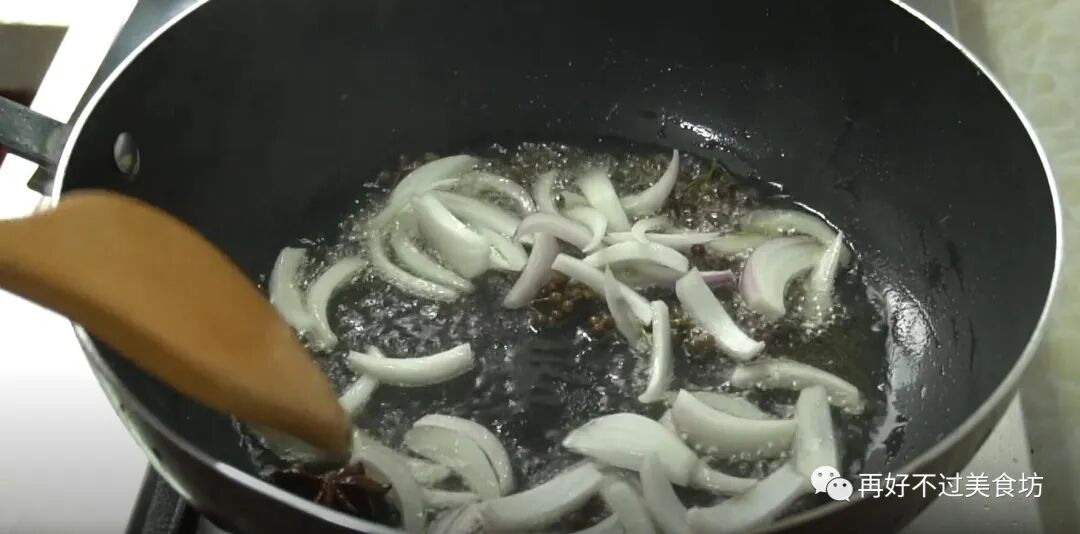 5、锅里倒入食用油,油热后,倒入鲜花椒,八角,还有切好的洋葱,先把这些食材的香味炒出来,等洋葱表面变黄,把它们盛出来。