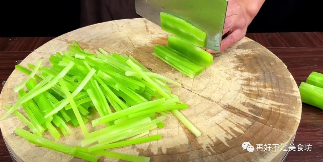 1、选莴笋的话,最好选择这种颜色深一点的,先用刀给它削去根部,再用刨刀刨去外皮,然后改刀切成小长段,再切成这种厚薄均匀的大片,最后切成细丝放盆中。