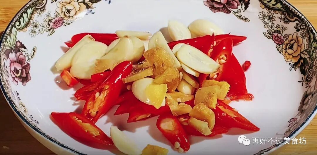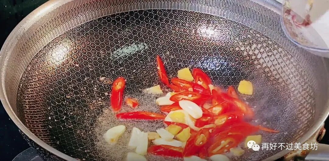 9、锅里留点底油,再把蒜片、辣椒加进来,快速翻炒一下,把姜蒜、辣椒的香味给它炒出来。