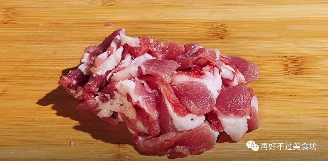 6、准备一块漂亮的里脊肉,这里最好选择半肥半瘦的,先把肉片改刀给它切成薄片,加入猪肉既可以增加肉香味,也可以用来配色,切好以后放入碗中。
