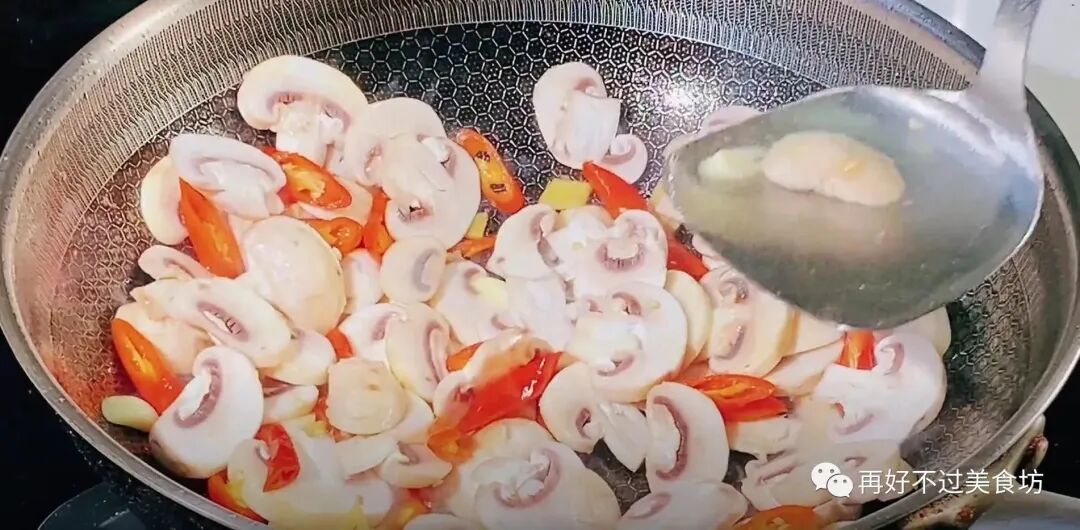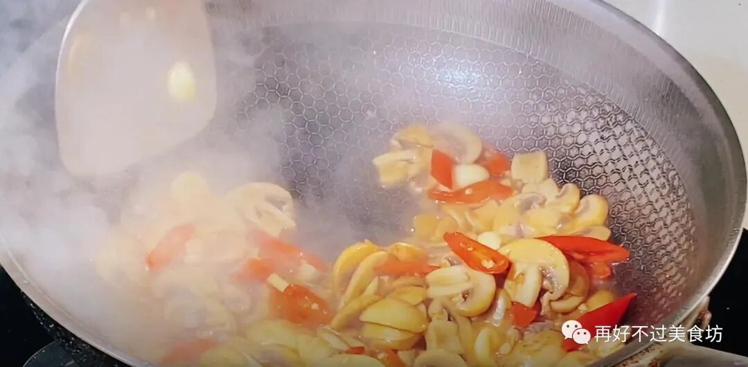 10、再把白蘑菇加进来,继续的翻炒均匀,提前把白蘑菇干锅给它翻炒一下,把蘑菇里面的汁水给它炒出来,再入少许的开水,这样可以让蘑菇更快的成熟。