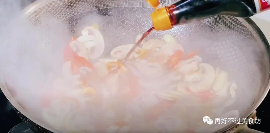 11、炒匀以后加半勺食盐,再淋入两圈生抽,加少许的蚝油,快速翻炒一下,提前把蘑菇给它炒至入味上色。