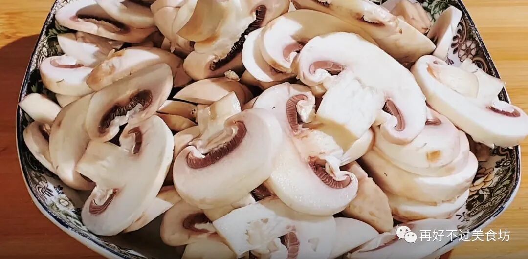 2、再把白蘑菇改刀给它切成厚一点的薄片,这里可以稍微的切厚一点,这样吃起来才会更香,都切好以后,放入盘中备用。