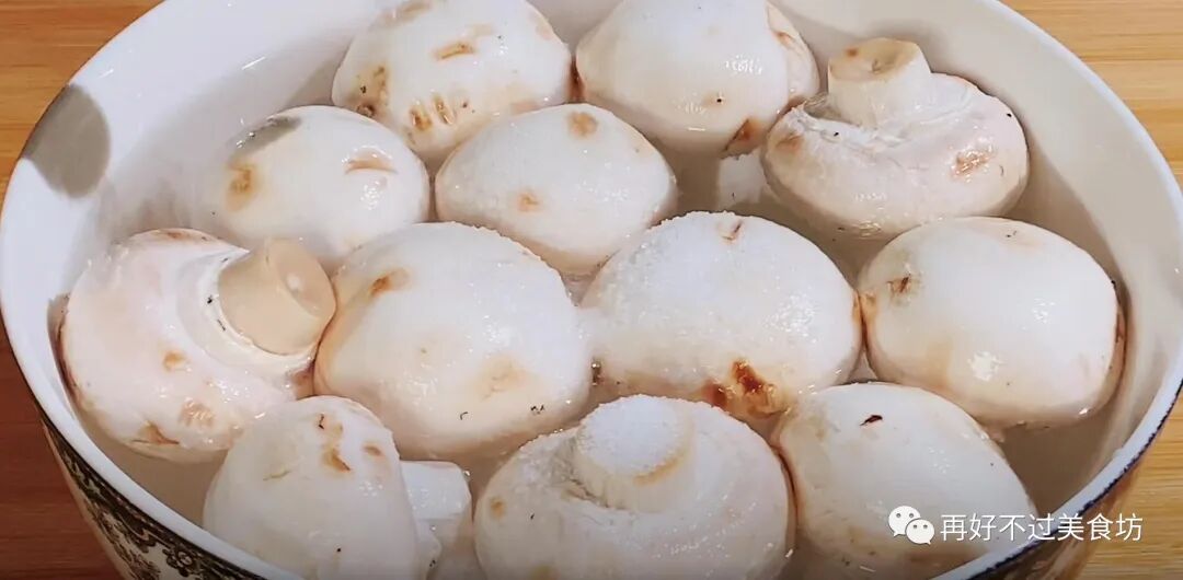 1、先把白蘑菇放入大盆中,加适量的清水,再加入一勺食盐,提前用淡盐水把白蘑菇给它浸泡一下,把表面的一些脏东西都给它清洗干净。