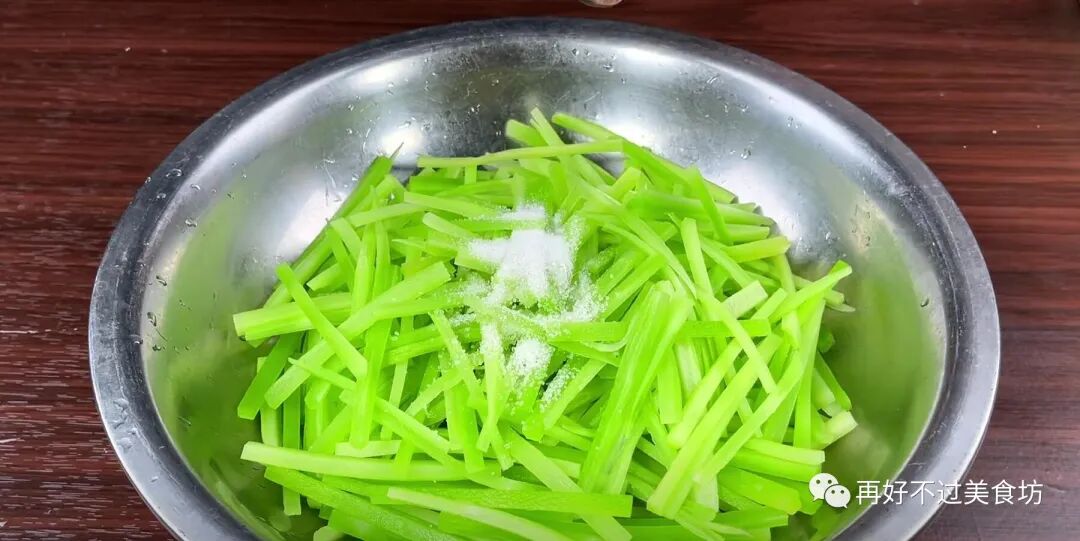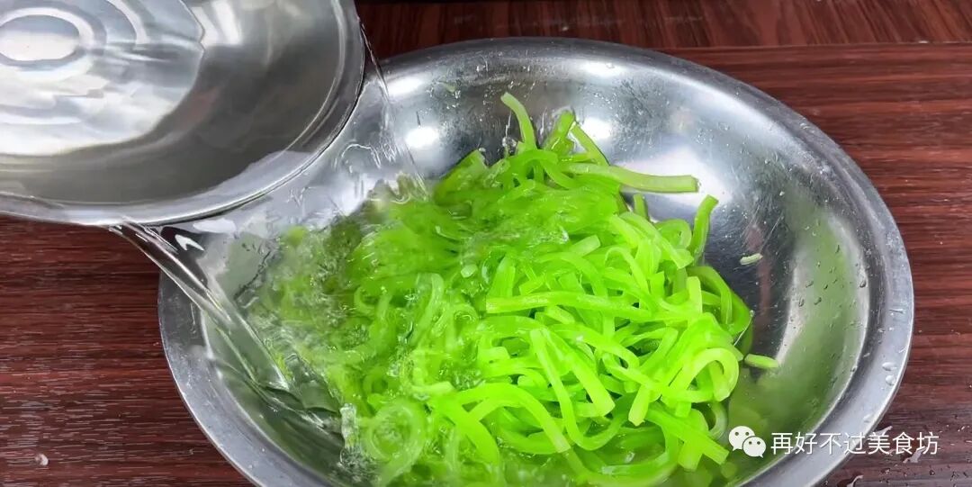 5、莴笋腌制十分钟后,已经杀出了很多水分,这时候加入清水给它清洗一下,在腌制的过程当中,如果里面的盐放的比较少,可以省掉清洗的这一步,最后控干水分,放在一旁。