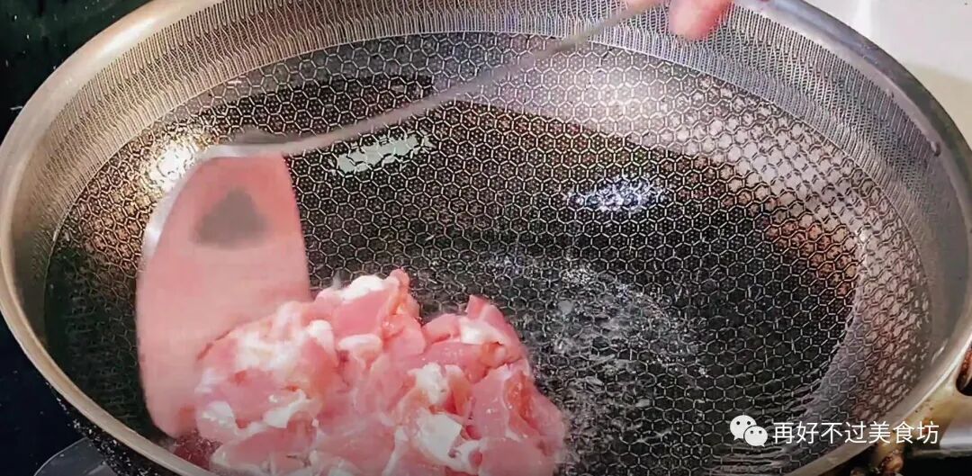 8、再把肉片加进来,快速翻炒一下,提前把肉片煸炒一下,可以去除肉腥味,也可以把肥肉里面的油脂煸出来一些,这样肉片吃起来会更香,把肉片给它炒至变色,就盛出来备用。