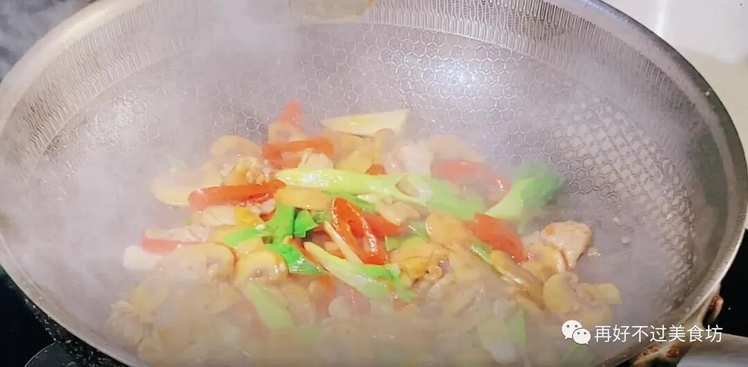 12、大火把蘑菇给它炒上三分钟左右,把蘑菇给它充分的炒软,这样吃起来才会更加的营养健康,所以蘑菇要稍微的切厚一点。