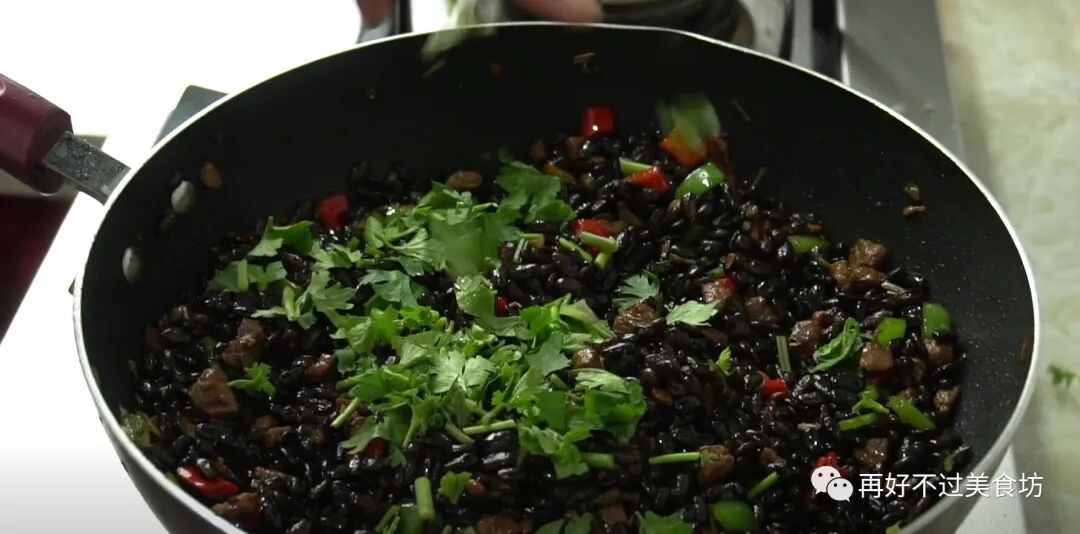 8、倒入蒸好的黑豆,继续翻炒四到五分钟,把黑豆里面的水分炒干,倒入青红椒,撒一点香菜,继续翻炒均匀就能出锅了。