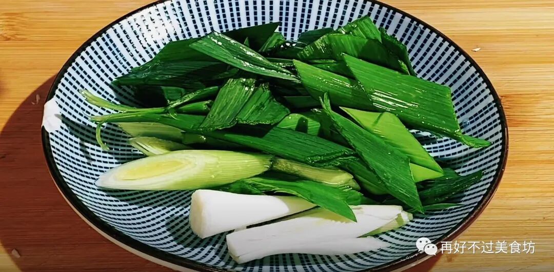 5、再准备一根青蒜,改刀给它切成薄片,加入青蒜既可以增加蒜香味,也可以用来配色。切好以后放入碗中。