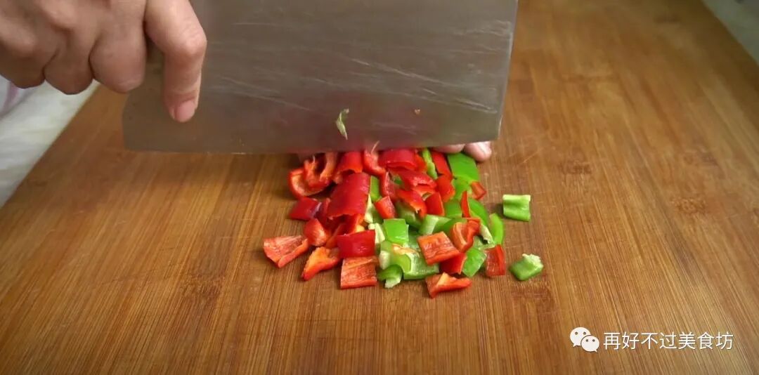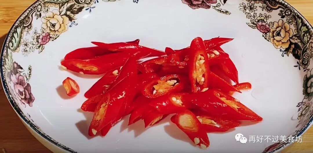 3、准备两根红辣椒,改刀给它切成薄片,加入红椒,主要是用来配色,喜欢吃辣的,可以加一点小米辣,切好以后放入盘中。