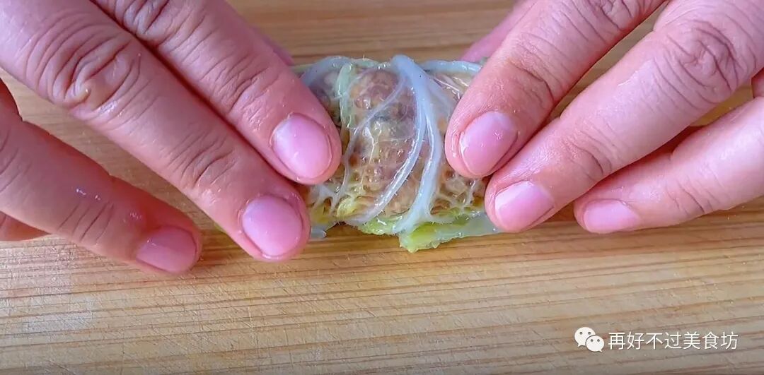 9、然后取出白菜,把白菜帮切掉,白菜帮我们可以煮面条吃,然后在白菜叶上放适量的肉馅,肉馅放紧实一些,然后对折起来,再从肉馅那里把它卷起来就可以了。