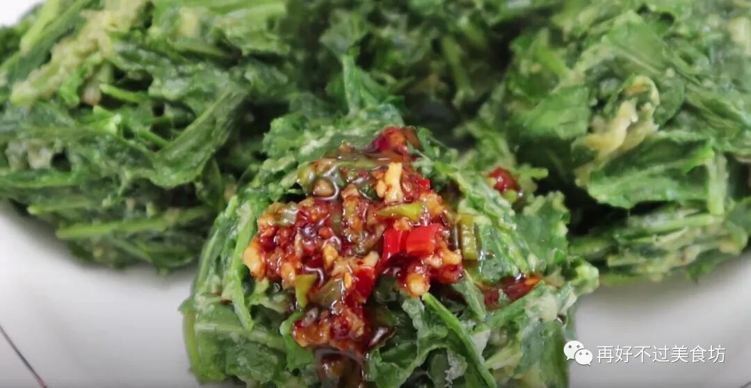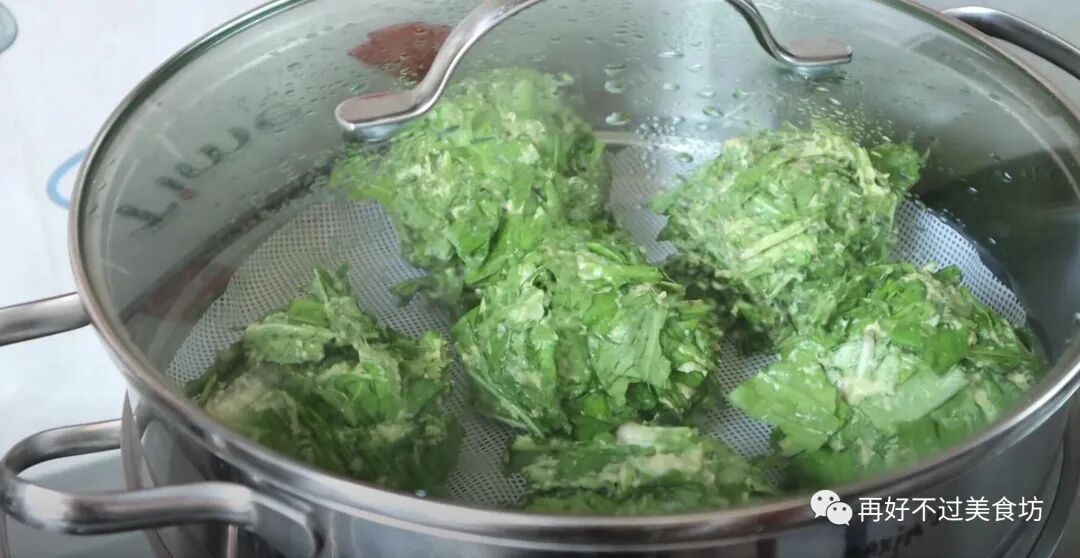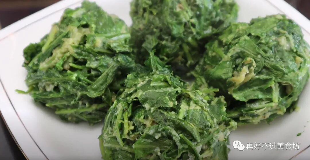 8、这个时候蒲公英野菜团子也蒸好了,颜色看着碧绿诱人,味道清香扑鼻,看着就很想吃,而且这个蒲公英的营养价值和药用价值非常的高,中老年人可以多吃这个,吃的时候再蘸上刚才做的油泼蒜辣子,美味极了。