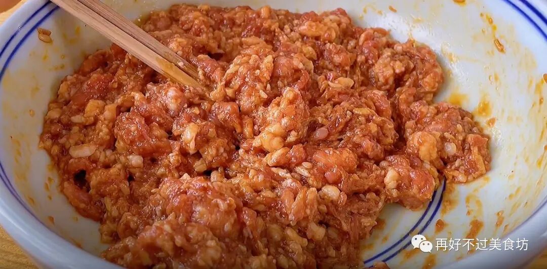 6、再准备一只空碗,放入五块钱的肉馅,然后加入三勺醪糟,醪糟我感觉比料酒好用,因为醪糟既能增香又能去腥,然后再加入少许老抽提色,再加入生抽和蚝油、鸡汁、小磨香油、十三香、食用盐,最后打入一颗鸡蛋,顺着一个方向搅至肉馅拉丝起劲的状态。