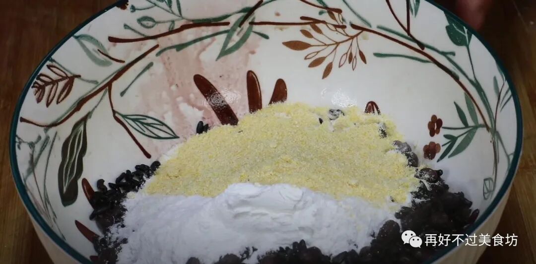 5、把蒸好的红豆、黑米倒入碗中,加入160克糯米粉、80克玉米粉,搅拌均匀,让食材均匀地包裹上玉米粉和糯米粉。