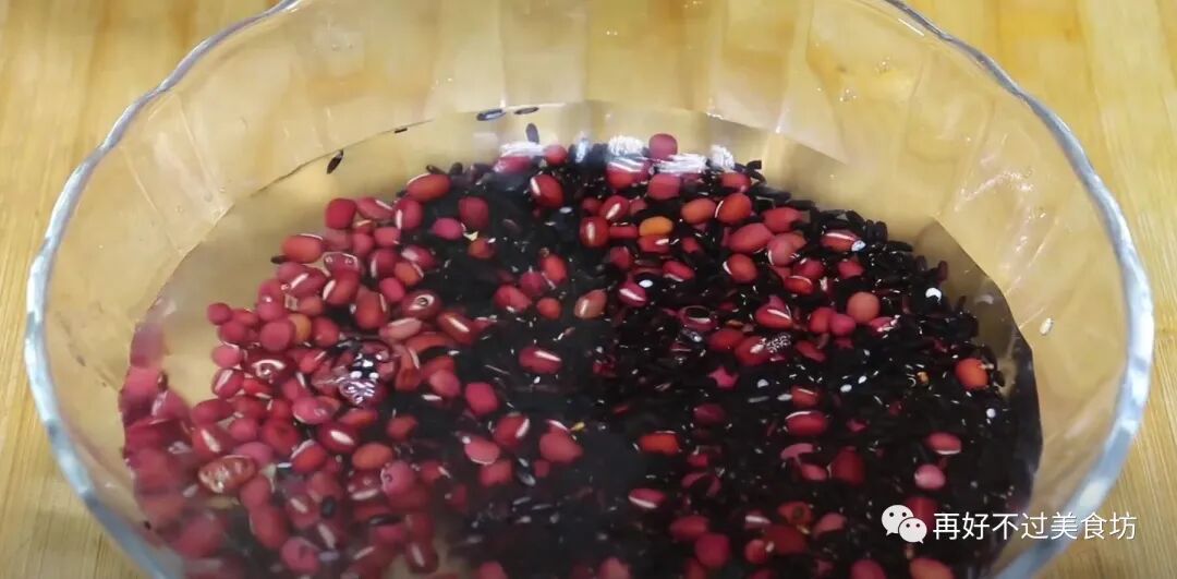 1、首先将200克红豆、200克黑米倒入碗中,加入清水洗干净,换水后,加入清水浸泡一晚。