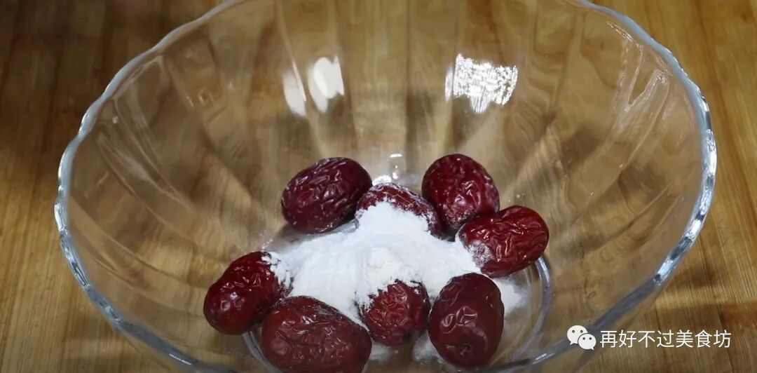 3、碗中放入适量红枣干,一勺面粉,抓拌至红枣沾上面粉,然后加入清水抓洗干净,控水后再清洗一次,放入案板切小块,取出枣核,将红枣切碎放入盘中。