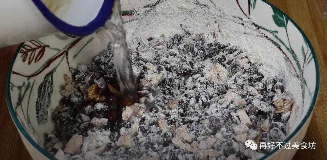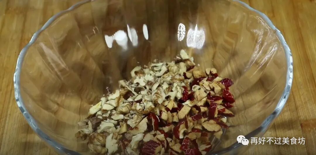 6、接着将红枣碎、核桃碎加进来,继续拌匀,加入50克温水继续搅拌,搅拌至食材粘合在一起就可以了。