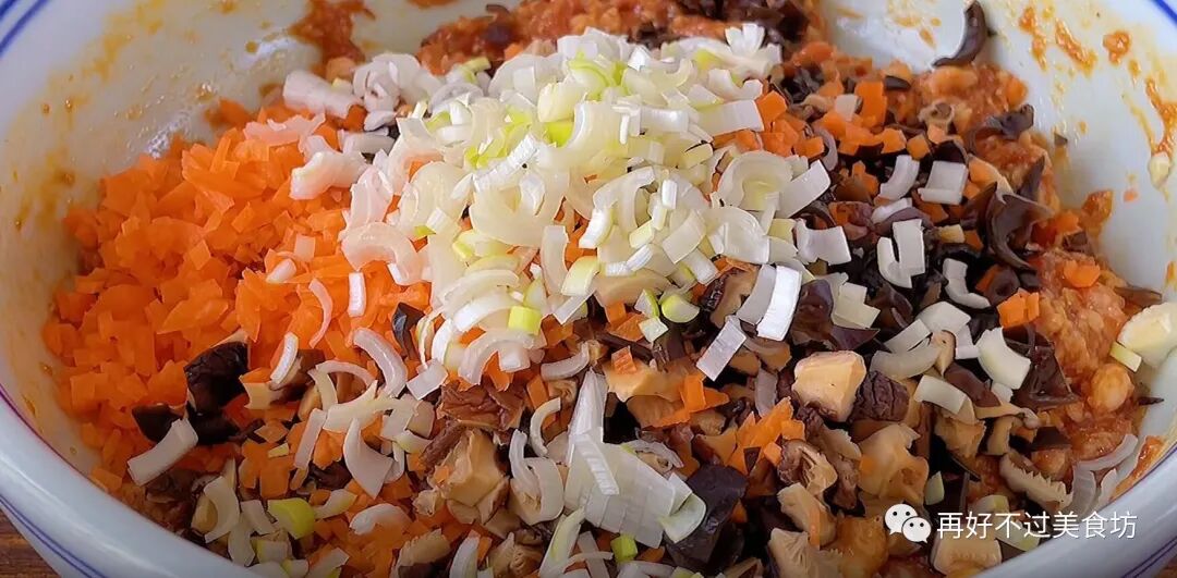 8、然后再准备半根胡萝卜,先切薄片,再切细丝,最后切成末,香菇攒干水分,先把它切成粗条,最后切丁,木耳也是切丁,全部切好,把它们直接放入肉馅里,然后加入葱花、姜末,去腥增香,再把所有食材搅拌均匀就可以了。