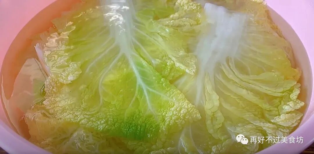 7、白菜泡好后,我们给它捞出来,先放入漏篮中控一下水,白菜的水控干净一点,后面就好操作。