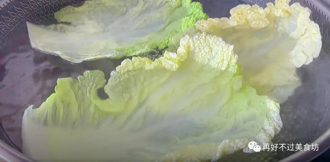 5、锅中水开后,白菜帮朝下,叶子朝上,一片一片放入白菜,放入白菜后,不要烫时间太长,大概有20秒左右,就给它捞出来,捞出的白菜,要赶紧放在凉水里面再泡一泡,这样白菜就会变得比较有韧性,不会破损掉。