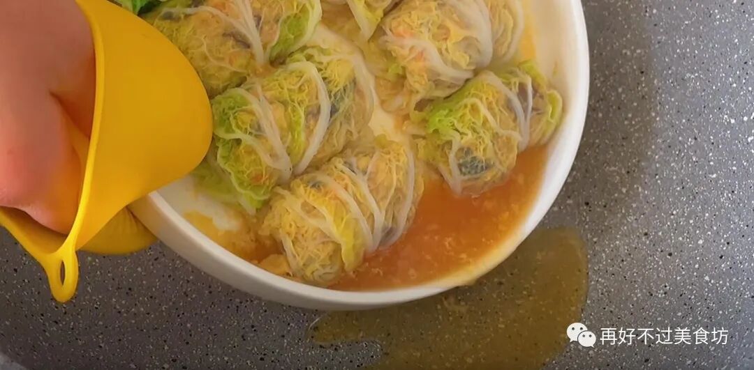 13、把芡汁再给它淋到白菜上面,这样做的白菜卷口味比较清淡,不油腻,一层比一层香,即使上火吃了也没问题,做法非常简单,喜欢的话可以收藏起来试一下。