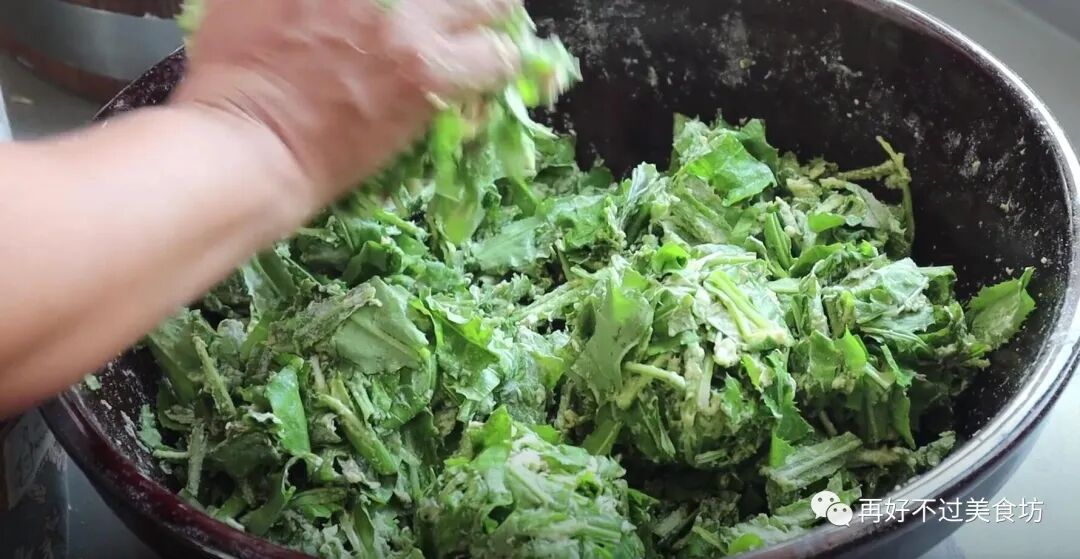 1、蒲公英摘洗干净后,直接切成小段装入盆里面,然后往盆里加入小勺的碱面,用两手翻拌均匀,这里加碱面可以使蒲公英在烹饪的过程中,保持颜色翠绿不变色。
