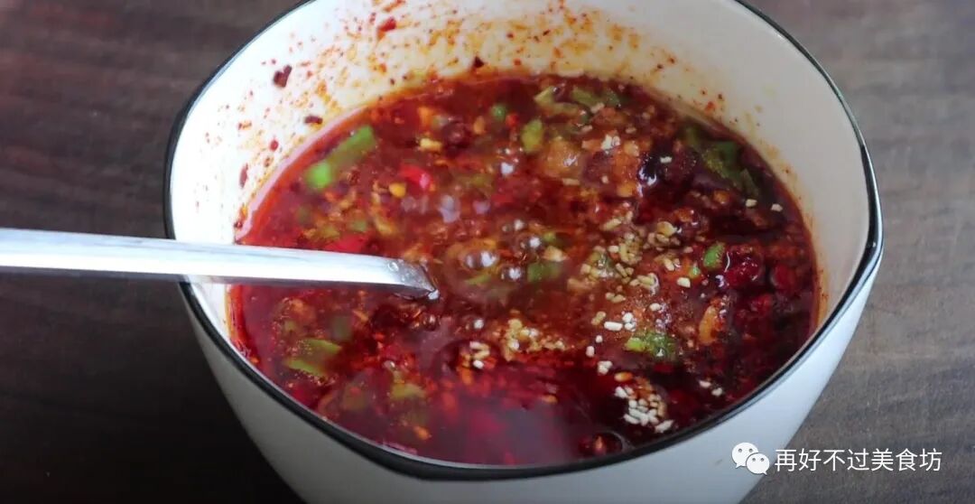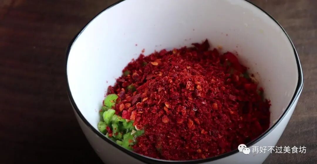 6、趁这个时间,来做一个简单的油泼蒜辣子,往碗里压点蒜泥,准备一个小米椒,切成小圈,再准备一个螺丝椒,也切得小一点,切好的辣椒也装入碗里,再往碗里加两勺辣椒面,然后泼入一勺热好的花椒油进去,用勺子搅拌均匀。