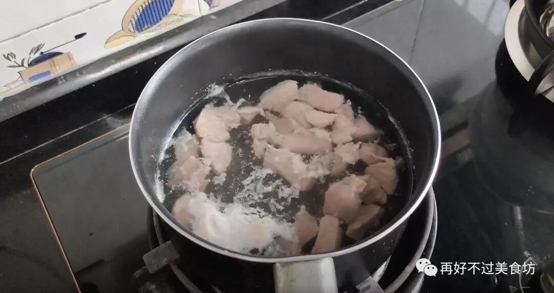 5、把切好的瘦肉,倒入锅里焯水,加入少许的白酒去腥,等它焯水两分钟,瘦肉已经变色,就捞出来控水。