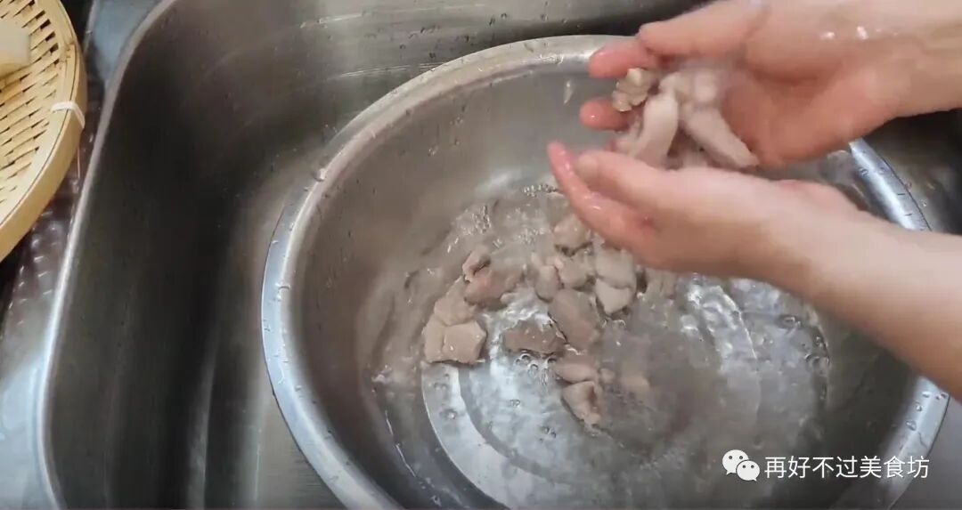 6、下面把焯过水的瘦肉放水龙头下,用流动的清水,将瘦肉冲洗干净。