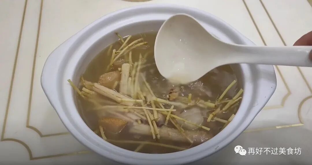 8、时间一到,加入少许盐调味,这个汤很清甜,其实不加盐也可以,桑白皮有利水消肿,白茅根有清热利尿,北沙参有养阴清肺,喜欢的朋友,也可以试下。