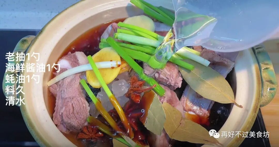 4、下一步开始调味,往里加入一勺老抽、一勺海鲜酱油、一勺蚝油、适量料酒和清水,盖上盖子,小火炖1小时。