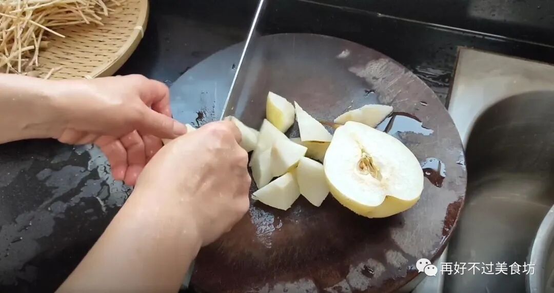 4、将雪梨清洗干净后,先是用刀切成小块,再把中间的梨核切掉,切好也放碗里备用。