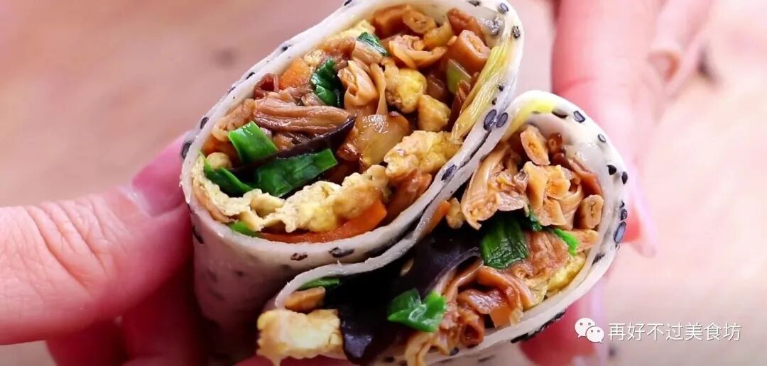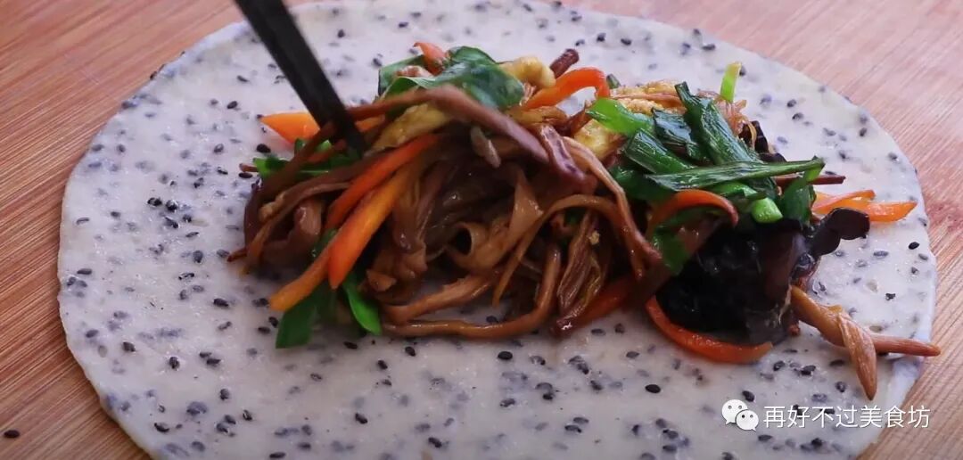 10、早餐拿出来煎一下或者蒸一下,都可以特别的节省时间,取一张黑芝麻小饼,放上一些提前炒的菜,卷起来就可以享用美味的早餐了。