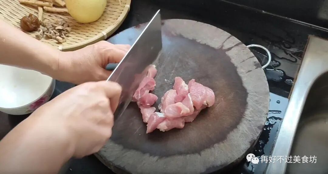 2、先把瘦肉改刀切成小块,全部切好后,就放碗里备用。