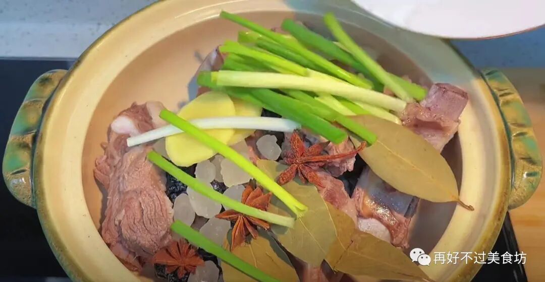 3、将焯过水的排骨、乌梅、冰糖、葱姜、大料香叶放进砂锅中。