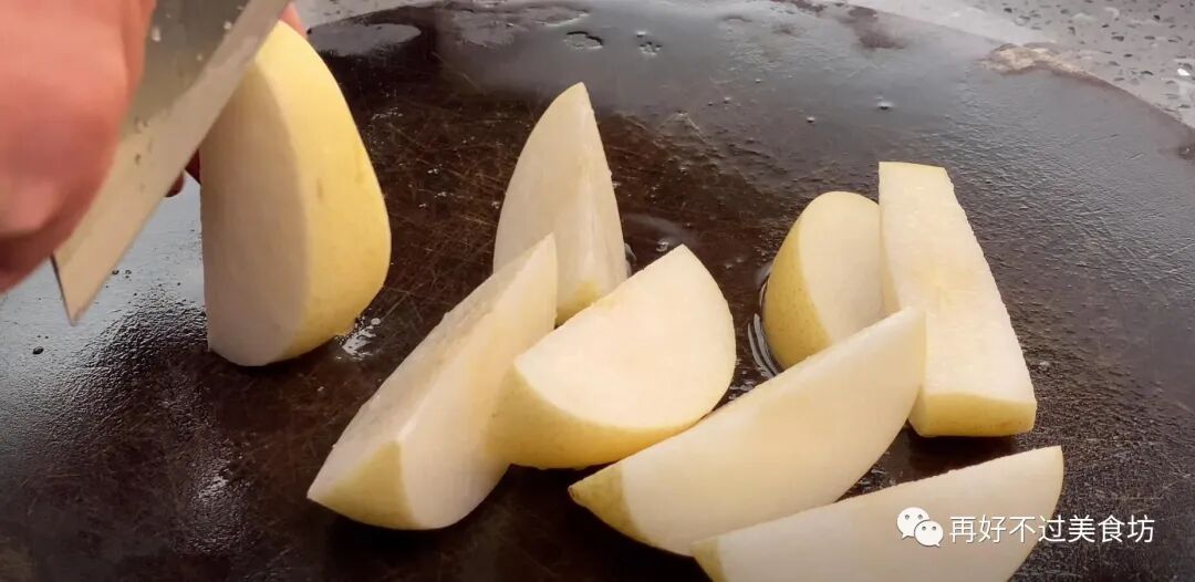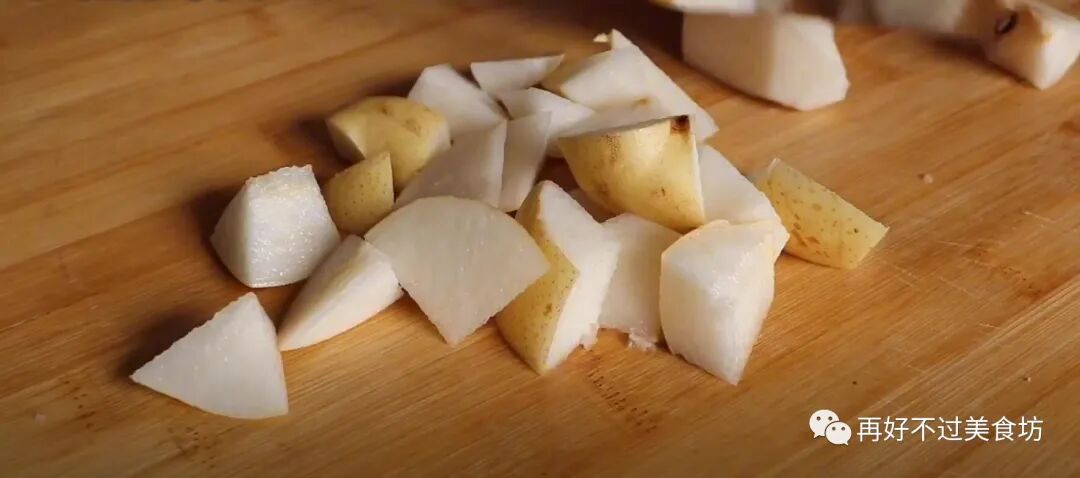 2、再准备一个雪梨,同样清洗干净之后,也不用去皮直接切成小块,中间的梨核就扔掉不要了。