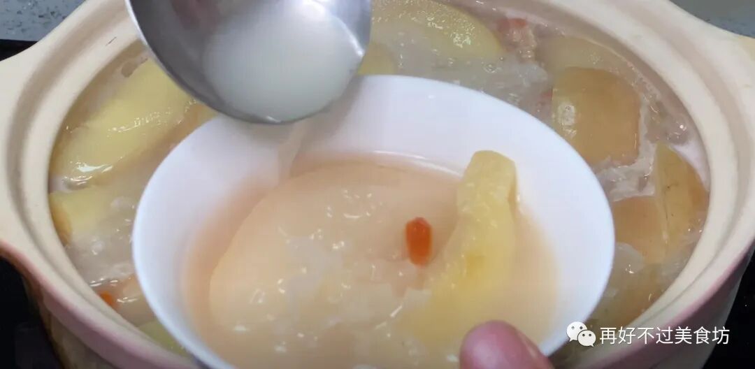7、时间一到,晾凉一点就能喝了,里面的甘蔗和马蹄口感非常不错,可以直接把它给吃掉,但是雪梨的口感就不太好,我们可以把它给扔掉,做法非常简单,每周喝一次就行了,喜欢就试试吧。