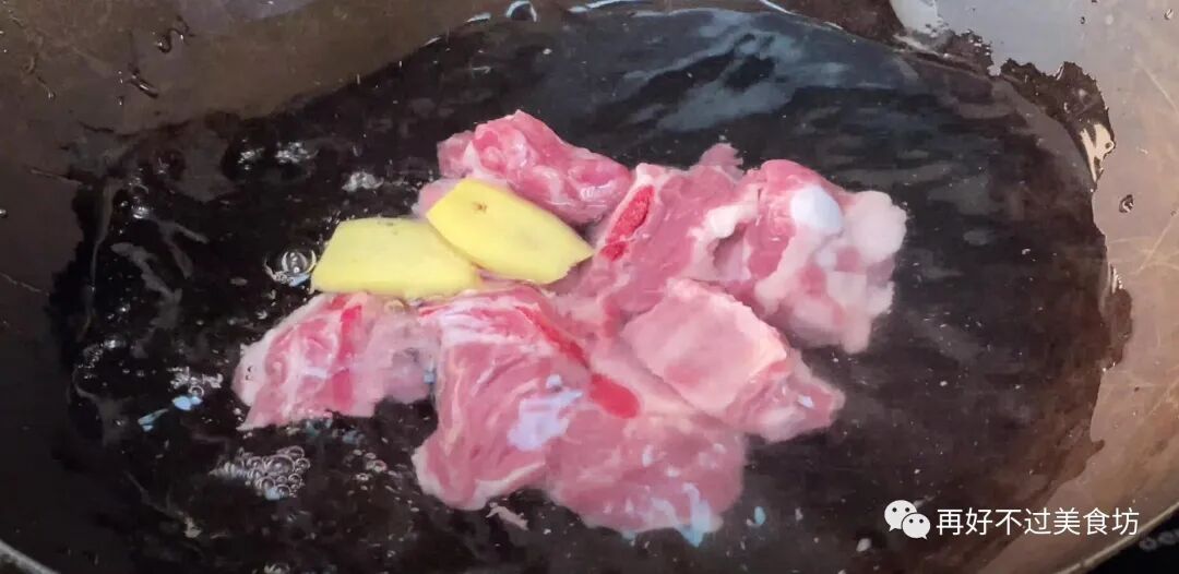 4、将排骨放入锅中,放一些姜,然后加入适量的清水,再放一些米酒去腥,等煮出血沫后,把排骨夹出来清洗干净。