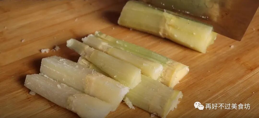 3、准备几节甘蔗,同样也削去外皮,然后用刀切成一段段的,我这里用的是青皮甘蔗。