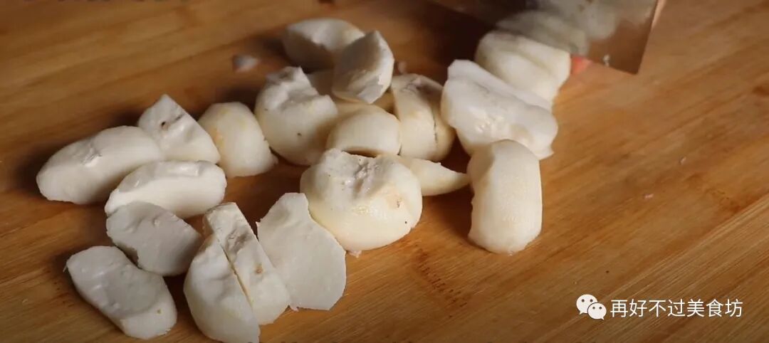 2、先准备10个马蹄,然后用工具削去外皮,去皮之后,再切成小块,放一旁留着备用。