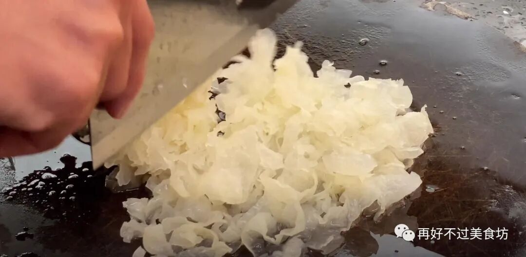 3、将银耳提前泡发好,然后捞出沥干水,放在案板上用刀切碎,就放一旁备用。